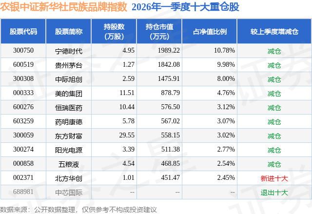从基金规模来看,农银中证新华社民族品牌指数基金2026年一季度公布的基金规模为1.85亿元,较上一期规模2.29亿元变化了-4483.06万元,环比变化了-19.55%。该基金最新一期资产配置为:股票占净值比94.81%,债券占净值比1.09%,现金占净值比4.45%。从基金持仓来看,该基金当季前十大股票仓位达50.49%,第一大重仓股为宁德时代(300750),持仓占比为10.78%。