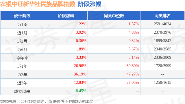 从业绩表现来看,农银中证新华社民族品牌指数基金过去一年净值涨幅为26.96%,在同类基金中排名1720/2999,同类基金过去一年净值涨幅中位数为30.8%。而基金过去一年的最大回撤为-9.52%,成立以来的最大回撤为-43.63%。