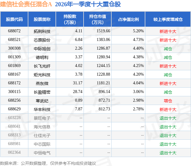 证券之星消息,日前建信社会责任混合A基金公布一季报,2026年一季度最新规模1.68亿元,季度净值涨幅为9.49%。