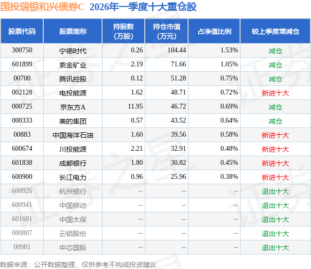 从基金规模来看,国投瑞银和兴债券C基金2026年一季度公布的基金规模为0.18亿元,较上一期规模1451.81万元变化了346.61万元,环比变化了23.87%。该基金最新一期资产配置为:股票占净值比13.82%,债券占净值比81.28%,现金占净值比1.58%。从基金持仓来看,该基金当季前十大股票仓位达7.27%,第一大重仓股为宁德时代(300750),持仓占比为1.53%。