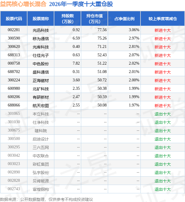 证券之星消息,日前益民核心增长混合基金公布一季报,2026年一季度最新规模0.25亿元,季度净值涨幅为-0.68%。
