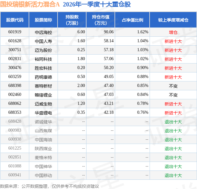 从基金规模来看,国投瑞银新活力混合A基金2026年一季度公布的基金规模为0.05亿元,较上一期规模4.05亿元变化了-4.0亿元,环比变化了-98.83%。该基金最新一期资产配置为:股票占净值比29.32%,债券占净值比96.8%,现金占净值比2.74%。从基金持仓来看,该基金当季前十大股票仓位达9.72%,第一大重仓股为中远海控(601919),持仓占比为1.62%。