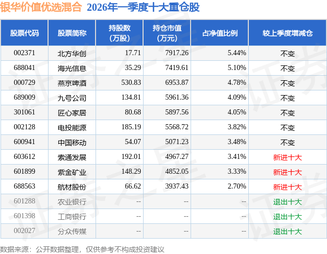 从基金规模来看,银华价值优选混合基金2026年一季度公布的基金规模为14.56亿元,较上一期规模17.42亿元变化了-2.85亿元,环比变化了-16.39%。该基金最新一期资产配置为:股票占净值比71.35%,无债券类资产,现金占净值比28.94%。从基金持仓来看,该基金当季前十大股票仓位达40.2%,第一大重仓股为北方华创(002371),持仓占比为5.44%。
