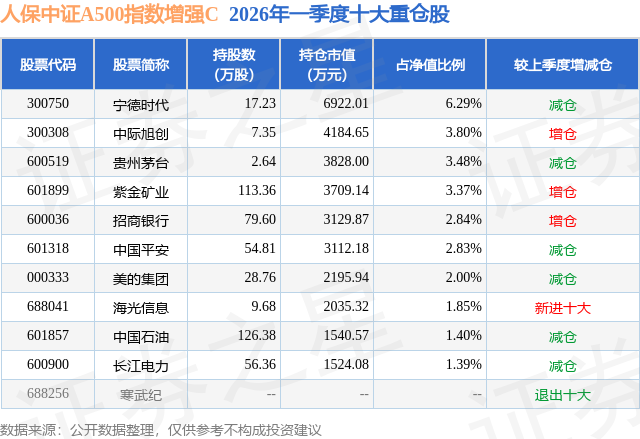 从基金规模来看,人保中证A500指数增强C基金2026年一季度公布的基金规模为0.47亿元。该基金最新一期资产配置为:股票占净值比93.58%,无债券类资产,现金占净值比6.32%。从基金持仓来看,该基金当季前十大股票仓位达29.25%,第一大重仓股为宁德时代(300750),持仓占比为6.29%。