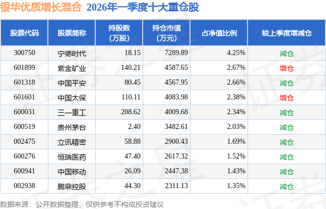 从基金规模来看,银华优质增长混合基金2026年一季度公布的基金规模为17.17亿元,较上一期规模16.54亿元变化了6272.31万元,环比变化了3.79%。该基金最新一期资产配置为:股票占净值比81.03%,债券占净值比5.6%,现金占净值比12.94%。从基金持仓来看,该基金当季前十大股票仓位达22.32%,第一大重仓股为宁德时代(300750),持仓占比为4.25%。