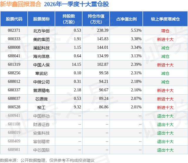 证券之星消息,日前新华鑫回报混合基金公布一季报,2026年一季度最新规模0.43亿元,季度净值涨幅为-5.12%。