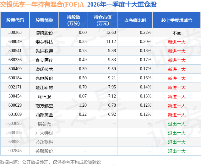 证券之星消息,日前交银优享一年持有混合(FOF)A基金公布一季报,2026年一季度最新规模0.47亿元,季度净值涨幅为0.83%。