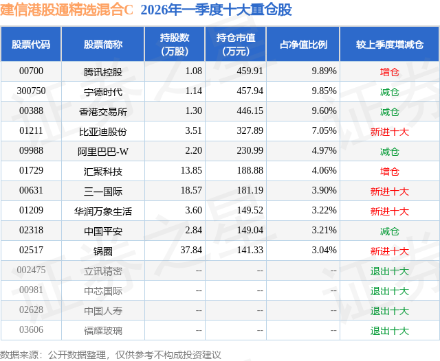 从基金规模来看,建信港股通精选混合C基金2026年一季度公布的基金规模为0.13亿元,较上一期规模1422.48万元变化了-157.93万元,环比变化了-11.1%。该基金最新一期资产配置为:股票占净值比78.63%,无债券类资产,现金占净值比21.89%。从基金持仓来看,该基金当季前十大股票仓位达58.79%,第一大重仓股为腾讯控股(00700),持仓占比为9.89%。