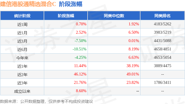 从业绩表现来看,建信港股通精选混合C基金过去一年净值涨幅为11.44%,在同类基金中排名3889/4475,同类基金过去一年净值涨幅中位数为38.19%。而基金过去一年的最大回撤为-20.21%,成立以来的最大回撤为-35.9%。