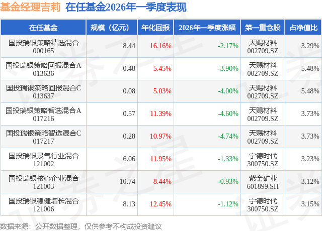 从基金规模来看,国投瑞银核心企业混合基金2026年一季度公布的基金规模为10.74亿元,较上一期规模7.8亿元变化了2.93亿元,环比变化了37.55%。该基金最新一期资产配置为:股票占净值比76.5%,无债券类资产,现金占净值比22.72%。从基金持仓来看,该基金当季前十大股票仓位达23.32%,第一大重仓股为紫金矿业(601899),持仓占比为3.12%。