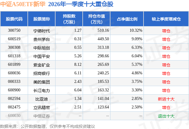 从基金规模来看,中证A50ETF新华基金2026年一季度公布的基金规模为0.49亿元,较上一期规模5011.41万元变化了-66.84万元,环比变化了-1.33%。该基金最新一期资产配置为:股票占净值比97.52%,无债券类资产,现金占净值比2.66%。从基金持仓来看,该基金当季前十大股票仓位达54.41%,第一大重仓股为宁德时代(300750),持仓占比为10.32%。