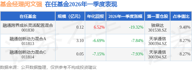 证券之星消息,日前融通创新动力混合C基金公布一季报,2026年一季度最新规模0.05亿元,季度净值涨幅为-7.93%。