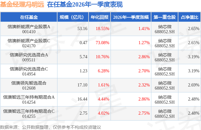 证券之星消息,日前信澳研究优选混合C基金公布一季报,2026年一季度最新规模1.23亿元,季度净值涨幅为2.7%。