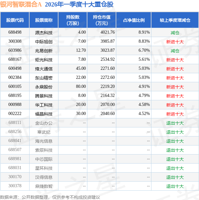 从基金规模来看,银河智联混合A基金2026年一季度公布的基金规模为3.71亿元,较上一期规模6.83亿元变化了-3.11亿元,环比变化了-45.63%。该基金最新一期资产配置为:股票占净值比88.13%,债券占净值比0.24%,现金占净值比10.52%。从基金持仓来看,该基金当季前十大股票仓位达58.91%,第一大重仓股为源杰科技(688498),持仓占比为8.91%。