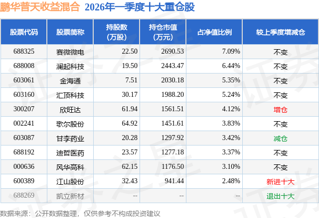 从基金规模来看,鹏华普天收益混合基金2026年一季度公布的基金规模为3.79亿元,较上一期规模3.66亿元变化了1294.88万元,环比变化了3.53%。该基金最新一期资产配置为:股票占净值比76.89%,债券占净值比21.32%,现金占净值比2.04%。从基金持仓来看,该基金当季前十大股票仓位达44.44%,第一大重仓股为赛微微电(688325),持仓占比为7.09%。