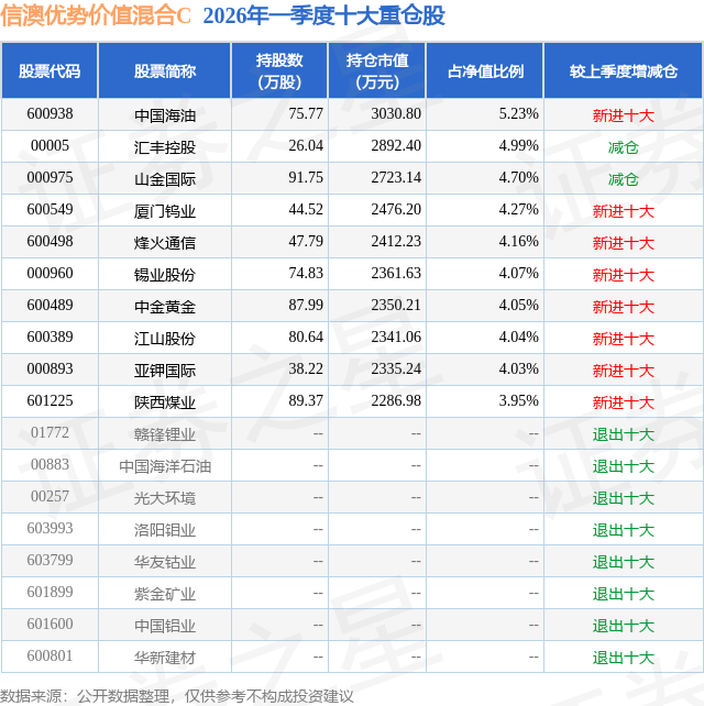 证券之星消息,日前信澳优势价值混合C基金公布一季报,2026年一季度最新规模0.52亿元,季度净值涨幅为-5.69%。