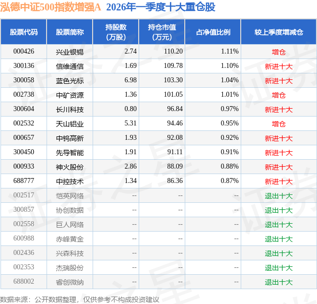 从基金规模来看,泓德中证500指数增强A基金2026年一季度公布的基金规模为0.56亿元。该基金最新一期资产配置为:股票占净值比89.07%,无债券类资产,现金占净值比10.09%。从基金持仓来看,该基金当季前十大股票仓位达9.76%,第一大重仓股为兴业银锡(000426),持仓占比为1.11%。