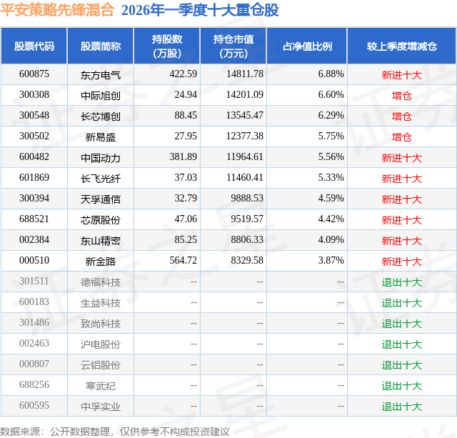 从基金规模来看,平安策略先锋混合基金2026年一季度公布的基金规模为21.52亿元,较上一期规模13.52亿元变化了8.0亿元,环比变化了59.17%。该基金最新一期资产配置为:股票占净值比69.78%,债券占净值比11.33%,现金占净值比11.19%。从基金持仓来看,该基金当季前十大股票仓位达53.38%,第一大重仓股为东方电气(600875),持仓占比为6.88%。
