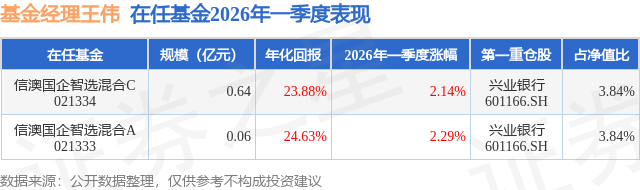 信澳国企智选混合A现任基金经理为王伟,本季度增聘基金经理王伟,近期离任的基金经理为林景艺。其中在任基金经理王伟已从业0年又248天,2025年8月18日正式接手管理信澳国企智选混合A,任职期间累计回报为15.73%。目前还管理着2只基金产品(包括A类和C类),其中本季度表现最佳的基金为信澳国企智选混合A(021333),季度净值涨幅为2.29%。