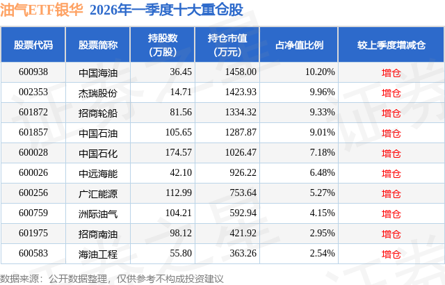 从基金规模来看,油气ETF银华基金2026年一季度公布的基金规模为1.43亿元,较上一期规模1263.86万元变化了1.3亿元,环比变化了1031.02%。该基金最新一期资产配置为:股票占净值比98.17%,无债券类资产,现金占净值比2.18%。从基金持仓来看,该基金当季前十大股票仓位达67.07%,第一大重仓股为中国海油(600938),持仓占比为10.2%。