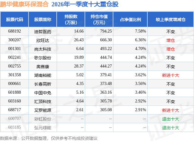 从基金规模来看,鹏华健康环保混合基金2026年一季度公布的基金规模为1.05亿元,较上一期规模1.01亿元变化了392.91万元,环比变化了3.89%。该基金最新一期资产配置为:股票占净值比79.48%,无债券类资产,现金占净值比20.72%。从基金持仓来看,该基金当季前十大股票仓位达43.59%,第一大重仓股为迪哲医药(688192),持仓占比为7.58%。
