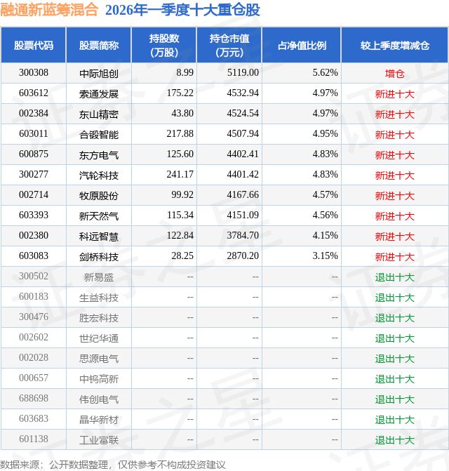 从基金规模来看,融通新蓝筹混合基金2026年一季度公布的基金规模为9.11亿元,较上一期规模8.7亿元变化了4074.18万元,环比变化了4.68%。该基金最新一期资产配置为:股票占净值比70.56%,债券占净值比23.06%,现金占净值比6.9%。从基金持仓来看,该基金当季前十大股票仓位达46.6%,第一大重仓股为中际旭创(300308),持仓占比为5.62%。