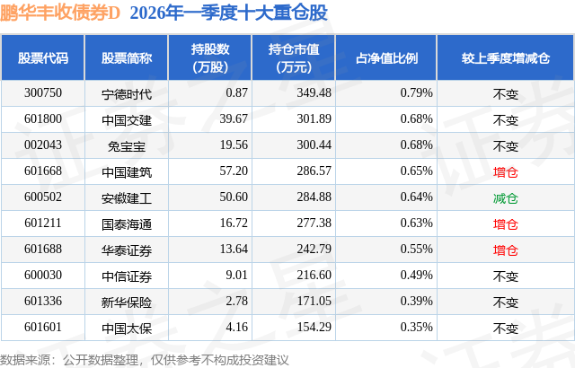 从基金规模来看,鹏华丰收债券D基金2026年一季度公布的基金规模为0.1亿元,较上一期规模0.0万元变化了1013.15万元,环比变化了101.62万倍。该基金最新一期资产配置为:股票占净值比13.63%,债券占净值比114.62%,现金占净值比2.15%。从基金持仓来看,该基金当季前十大股票仓位达5.85%,第一大重仓股为宁德时代(300750),持仓占比为0.79%。