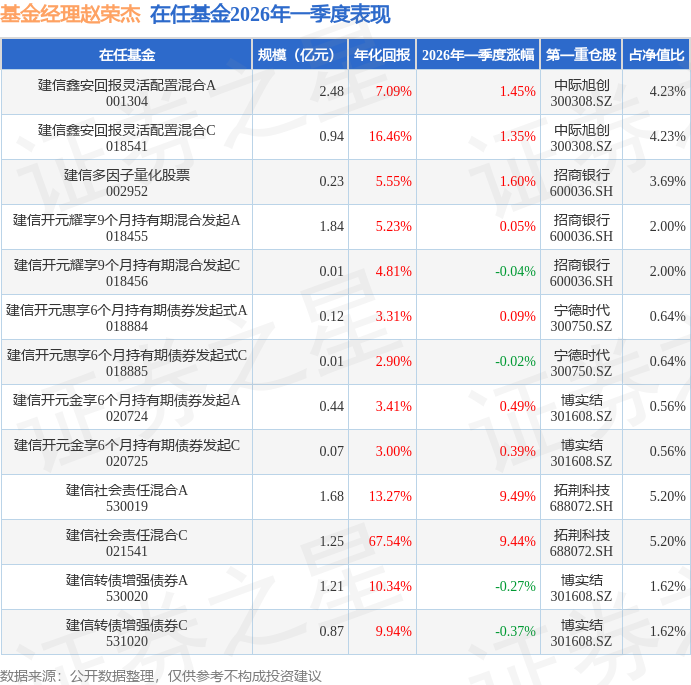 建信社会责任混合C现任基金经理为赵荣杰,本季度增聘基金经理赵荣杰,近期离任的基金经理为李登虎。其中在任基金经理赵荣杰已从业2年又259天,2026年3月6日正式接手管理建信社会责任混合C,任职期间累计回报为15.77%。目前还管理着13只基金产品(包括A类和C类),其中本季度表现最佳的基金为建信社会责任混合A(530019),季度净值涨幅为9.49%。