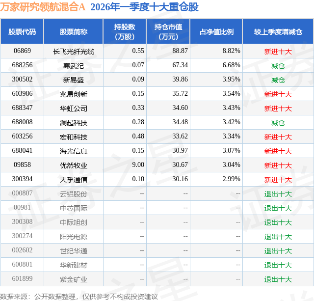 从基金规模来看,万家研究领航混合A基金2026年一季度公布的基金规模为0.07亿元,较上一期规模3529.84万元变化了-2864.72万元,环比变化了-81.16%。该基金最新一期资产配置为:股票占净值比85.8%,无债券类资产,现金占净值比13.6%。从基金持仓来看,该基金当季前十大股票仓位达42.28%,第一大重仓股为长飞光纤光缆(06869),持仓占比为8.82%。