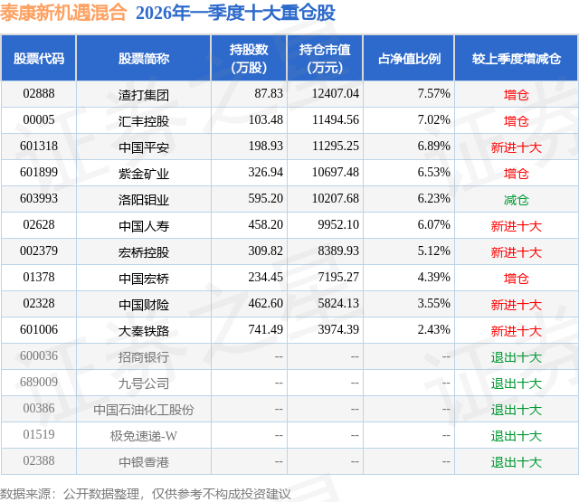 从基金规模来看,泰康新机遇混合基金2026年一季度公布的基金规模为16.38亿元,较上一期规模16.15亿元变化了2346.26万元,环比变化了1.45%。该基金最新一期资产配置为:股票占净值比81.28%,债券占净值比9.44%,现金占净值比0.13%。从基金持仓来看,该基金当季前十大股票仓位达55.8%,第一大重仓股为渣打集团(02888),持仓占比为7.57%。