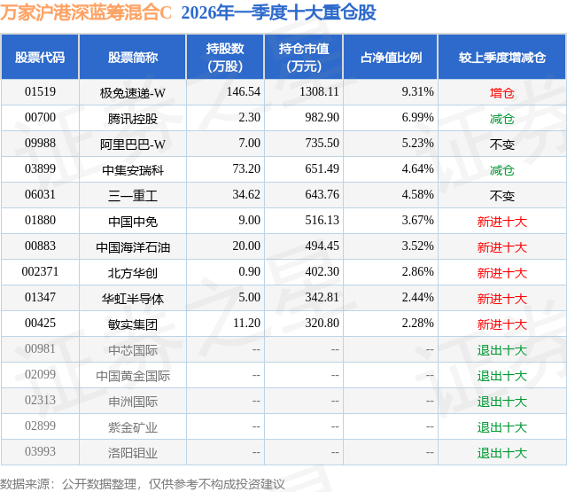从基金规模来看,万家沪港深蓝筹混合C基金2026年一季度公布的基金规模为0.15亿元,较上一期规模1525.63万元变化了-48.78万元,环比变化了-3.2%。该基金最新一期资产配置为:股票占净值比87.26%,债券占净值比0.22%,现金占净值比13.05%。从基金持仓来看,该基金当季前十大股票仓位达45.52%,第一大重仓股为极兔速递-W(01519),持仓占比为9.31%。