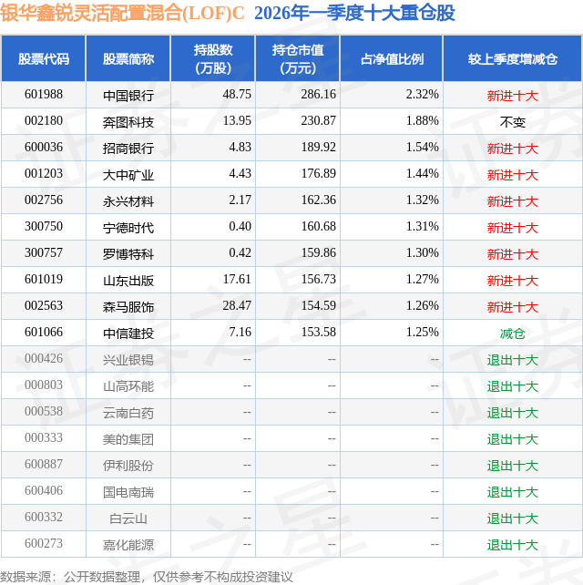 从基金规模来看,银华鑫锐灵活配置混合(LOF)C基金2026年一季度公布的基金规模为0.03亿元,较上一期规模5053.33万元变化了-4711.31万元,环比变化了-93.23%。该基金最新一期资产配置为:股票占净值比83.82%,债券占净值比2.7%,现金占净值比12.9%。从基金持仓来看,该基金当季前十大股票仓位达14.89%,第一大重仓股为中国银行(601988),持仓占比为2.32%。