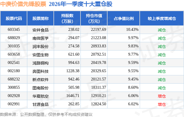 从基金规模来看,中庚价值先锋股票基金2026年一季度公布的基金规模为21.29亿元,较上一期规模40.8亿元变化了-19.51亿元,环比变化了-47.82%。该基金最新一期资产配置为:股票占净值比94.26%,债券占净值比5.14%,现金占净值比0.53%。从基金持仓来看,该基金当季前十大股票仓位达89.27%,第一大重仓股为安井食品(603345),持仓占比为10.43%。