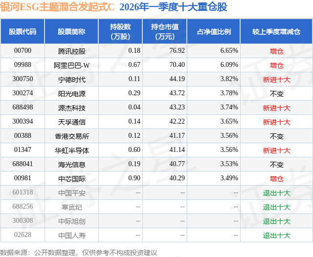 从基金规模来看,银河ESG主题混合发起式C基金2026年一季度公布的基金规模为0.01亿元,较上一期规模104.5万元变化了11.05万元,环比变化了10.57%。该基金最新一期资产配置为:股票占净值比94.19%,无债券类资产,现金占净值比8.09%。从基金持仓来看,该基金当季前十大股票仓位达41.87%,第一大重仓股为腾讯控股(00700),持仓占比为6.65%。