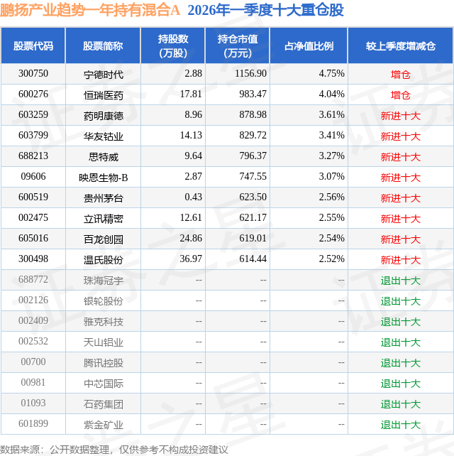 从基金规模来看,鹏扬产业趋势一年持有混合A基金2026年一季度公布的基金规模为2.35亿元,较上一期规模2.42亿元变化了-681.24万元,环比变化了-2.81%。该基金最新一期资产配置为:股票占净值比88.77%,债券占净值比6.09%,现金占净值比9.24%。从基金持仓来看,该基金当季前十大股票仓位达32.32%,第一大重仓股为宁德时代(300750),持仓占比为4.75%。