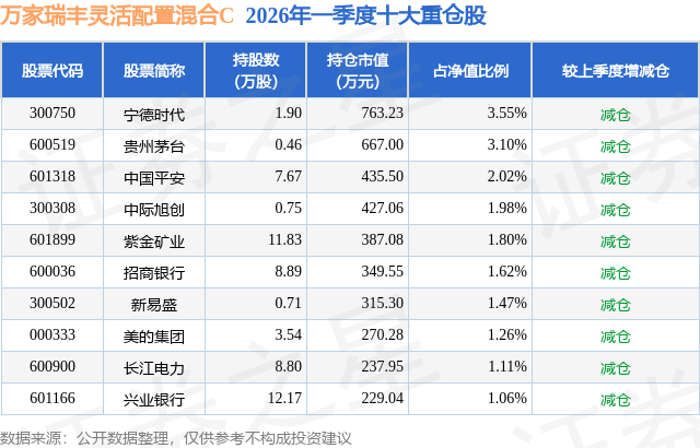 从基金规模来看,万家瑞丰灵活配置混合C基金2026年一季度公布的基金规模为0.11亿元,较上一期规模995.14万元变化了85.2万元,环比变化了8.56%。该基金最新一期资产配置为:股票占净值比93.86%,无债券类资产,现金占净值比6.21%。从基金持仓来看,该基金当季前十大股票仓位达18.97%,第一大重仓股为宁德时代(300750),持仓占比为3.55%。