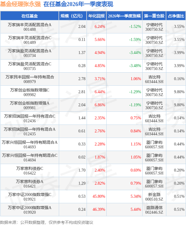 证券之星消息,日前万家瑞丰灵活配置混合C基金公布一季报,2026年一季度最新规模0.11亿元,季度净值涨幅为-1.59%。