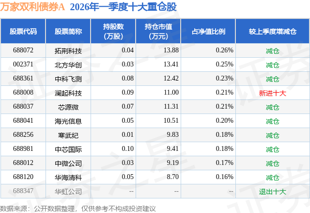 从基金规模来看,万家双利债券A基金2026年一季度公布的基金规模为0.38亿元,较上一期规模2.42亿元变化了-2.04亿元,环比变化了-84.2%。该基金最新一期资产配置为:股票占净值比2.87%,债券占净值比95.87%,现金占净值比1.81%。从基金持仓来看,该基金当季前十大股票仓位达2.05%,第一大重仓股为拓荆科技(688072),持仓占比为0.26%。