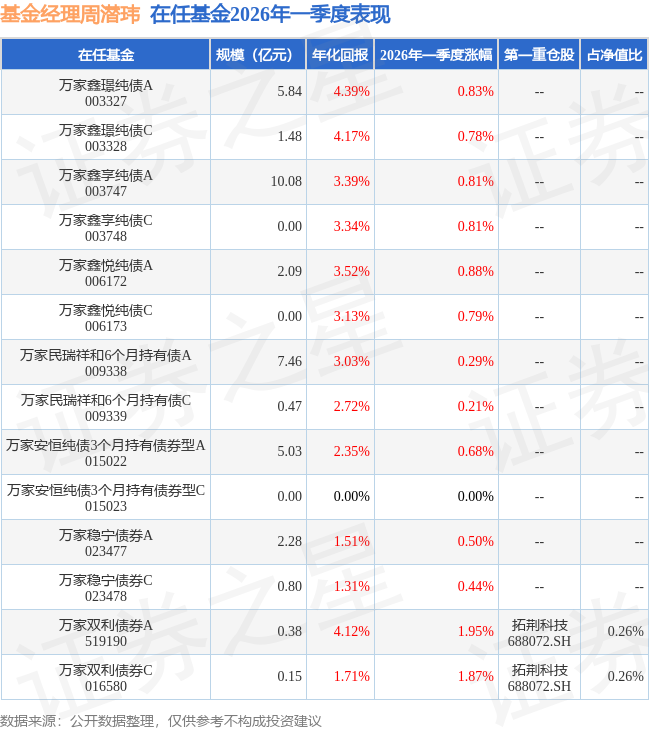 证券之星消息,日前万家双利债券A基金公布一季报,2026年一季度最新规模0.38亿元,季度净值涨幅为1.95%。