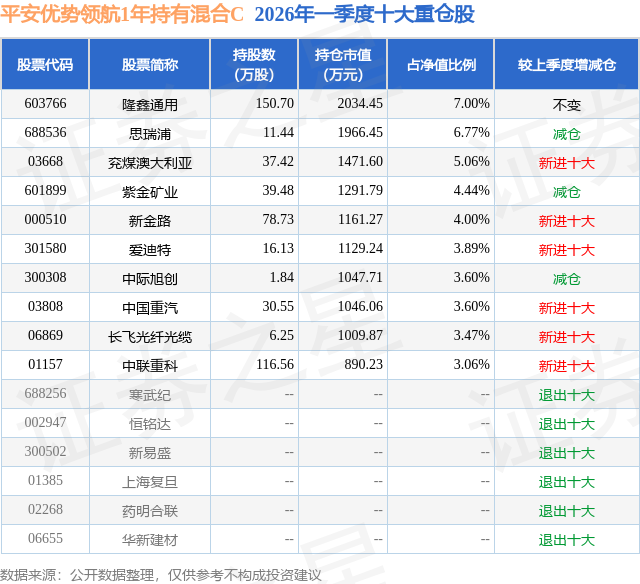 从基金规模来看,平安优势领航1年持有混合C基金2026年一季度公布的基金规模为0.04亿元,较上一期规模396.9万元变化了-12.94万元,环比变化了-3.26%。该基金最新一期资产配置为:股票占净值比86.44%,无债券类资产,现金占净值比15.39%。从基金持仓来看,该基金当季前十大股票仓位达44.89%,第一大重仓股为隆鑫通用(603766),持仓占比为7.0%。