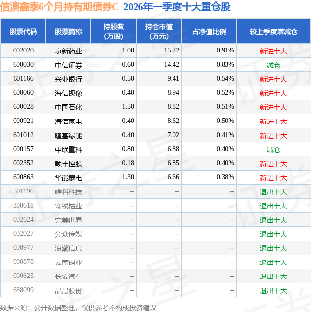 从基金规模来看,信澳鑫泰6个月持有期债券C基金2026年一季度公布的基金规模为0.1亿元,较上一期规模6.31亿元变化了-6.2亿元,环比变化了-98.35%。该基金最新一期资产配置为:股票占净值比9.22%,债券占净值比86.21%,现金占净值比8.14%。从基金持仓来看,该基金当季前十大股票仓位达5.4%,第一大重仓股为京新药业(002020),持仓占比为0.91%。