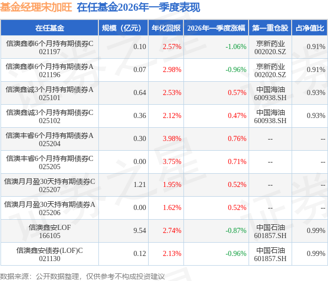 证券之星消息,日前信澳鑫泰6个月持有期债券C基金公布一季报,2026年一季度最新规模0.1亿元,季度净值涨幅为-1.06%。