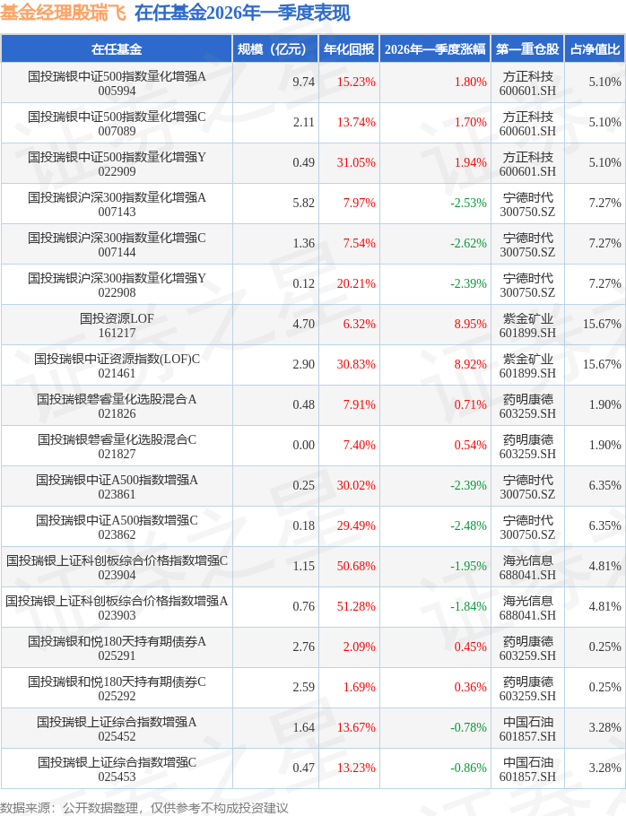 证券之星消息,日前国投瑞银中证500指数量化增强Y基金公布一季报,2026年一季度最新规模0.49亿元,季度净值涨幅为1.94%。