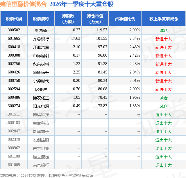 从基金规模来看,建信恒稳价值混合基金2026年一季度公布的基金规模为0.4亿元,较上一期规模3815.23万元变化了181.92万元,环比变化了4.77%。该基金最新一期资产配置为:股票占净值比42.36%,无债券类资产,现金占净值比54.65%。从基金持仓来看,该基金当季前十大股票仓位达22.52%,第一大重仓股为新易盛(300502),持仓占比为2.99%。