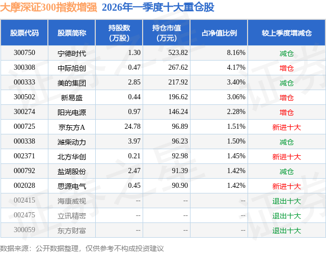 从基金规模来看,大摩深证300指数增强基金2026年一季度公布的基金规模为0.64亿元,较上一期规模5351.4万元变化了1066.72万元,环比变化了19.93%。该基金最新一期资产配置为:股票占净值比93.97%,债券占净值比4.72%,现金占净值比1.74%。从基金持仓来看,该基金当季前十大股票仓位达28.37%,第一大重仓股为宁德时代(300750),持仓占比为8.16%。