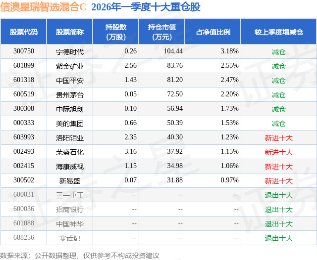 从基金规模来看,信澳星瑞智选混合C基金2026年一季度公布的基金规模为0.3亿元。该基金最新一期资产配置为:股票占净值比90.34%,无债券类资产,现金占净值比7.24%。从基金持仓来看,该基金当季前十大股票仓位达18.07%,第一大重仓股为宁德时代(300750),持仓占比为3.18%。