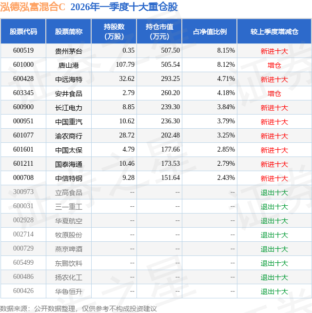 从基金规模来看,泓德泓富混合C基金2026年一季度公布的基金规模为0.07亿元,较上一期规模151.24万元变化了584.23万元,环比变化了386.3%。该基金最新一期资产配置为:股票占净值比70.68%,债券占净值比1.11%,现金占净值比31.86%。从基金持仓来看,该基金当季前十大股票仓位达44.11%,第一大重仓股为贵州茅台(600519),持仓占比为8.15%。