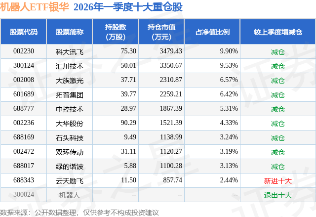 从基金规模来看,机器人ETF银华基金2026年一季度公布的基金规模为3.52亿元,较上一期规模5.05亿元变化了-1.53亿元,环比变化了-30.31%。该基金最新一期资产配置为:股票占净值比99.11%,无债券类资产,现金占净值比0.97%。从基金持仓来看,该基金当季前十大股票仓位达54.06%,第一大重仓股为科大讯飞(002230),持仓占比为9.9%。