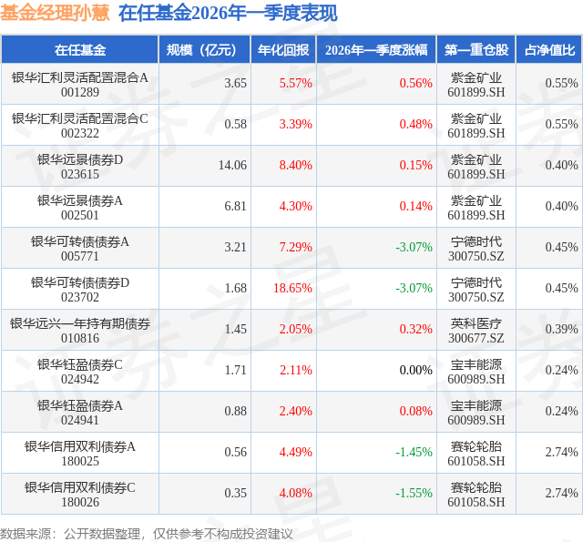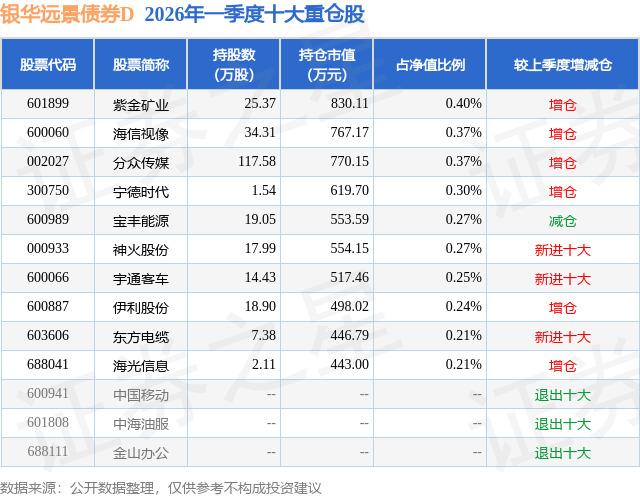 从基金规模来看,银华远景债券D基金2026年一季度公布的基金规模为14.06亿元。该基金最新一期资产配置为:股票占净值比15.03%,债券占净值比110.45%,现金占净值比2.53%。从基金持仓来看,该基金当季前十大股票仓位达2.89%,第一大重仓股为紫金矿业(601899),持仓占比为0.4%。