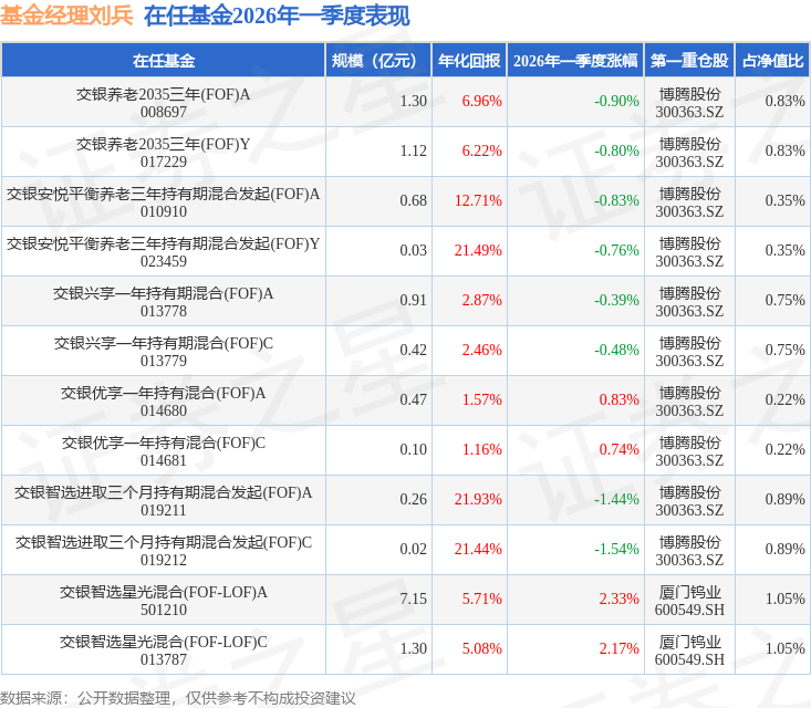 证券之星消息,日前交银兴享一年持有期混合(FOF)A基金公布一季报,2026年一季度最新规模0.91亿元,季度净值涨幅为-0.39%。